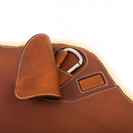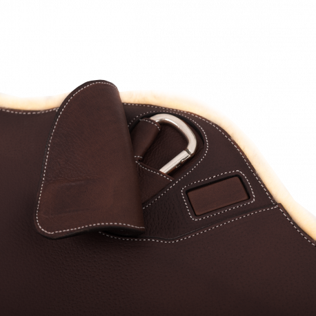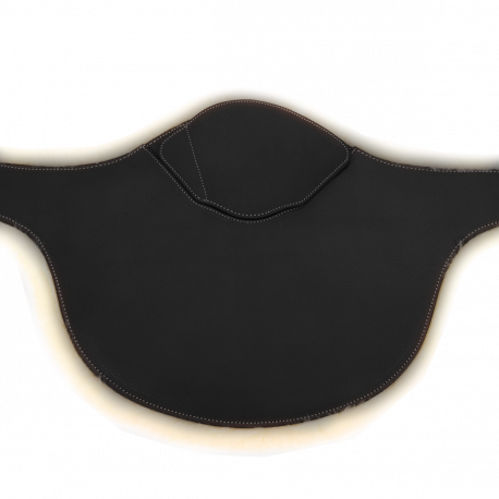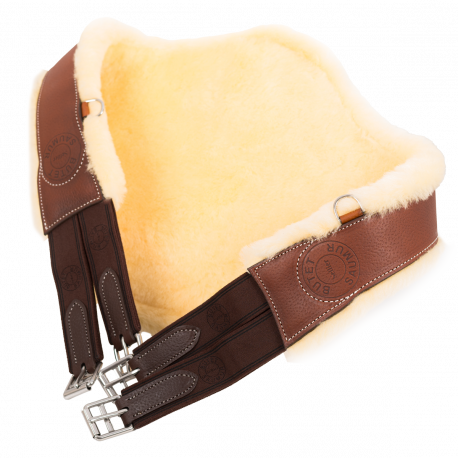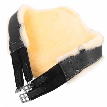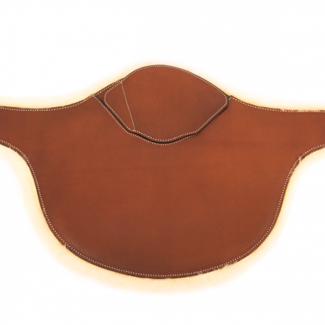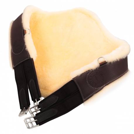 The BUTET embossed ergonomic sheepskin belly guard girth comes with a central snap hook with its magnetic snap hook cover, a D-ring and two elastic straps on either side. The ergonomic belly guard girth is recommended for jumping.