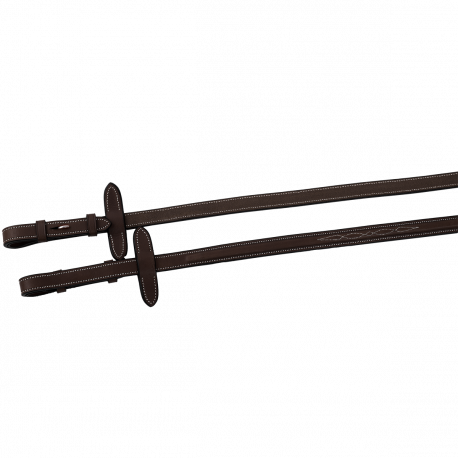 Sturdy and safe soft rubber reins with nylon interior. Leather ends.