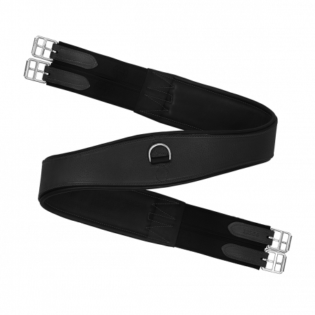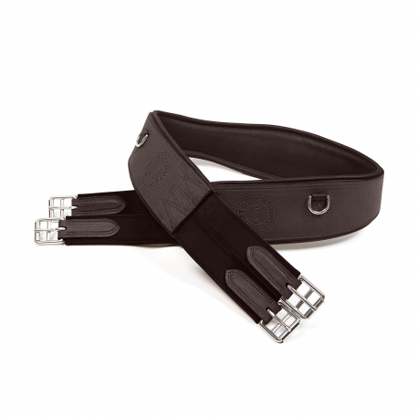 La sangle classique asymétrique estampillée Butet est équipée d’un mousqueton central, d’un anneau d’attache de chaque côté et de quatre élastiques aux extrémités.